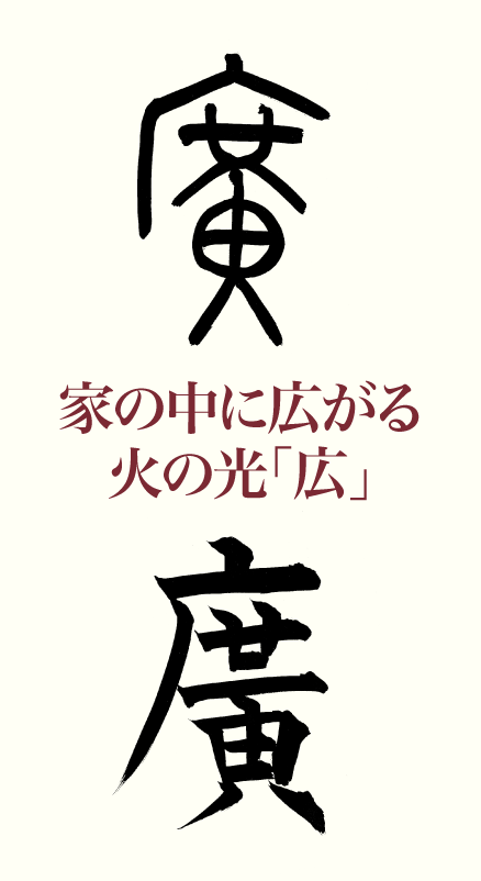 最近のスマートフォンのカメラは広角機能も付いているなど、利便性が高まっていますね。今回は広角の『広』について見ていきます。『広』の旧字体は『廣』になります。『廣』を分解すると、『广・まだれ』+『黄』となります。『广』は家や屋根を表します。一方、『黄』は、もともとは、『火矢≒火を仕掛けて射る矢を描いたもの』で、その火の光から『炎の黄色、広がる火の光』を表した文字とされております。これらを組み合わせることで、『家の中に広がる火の光』から転じて『広い』という意味になったとされます。コロナが収束したら、日本の名所に出向いて美しい光景を、広角機能も使いながら撮影したいものです。