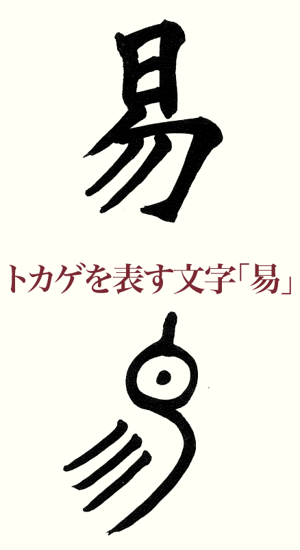 トカゲの皮膚の色が変わるところから「かわる」変易へんえき、「かんたん」容易ようい、「やさしい」安易あんい、占いにより吉凶を判断する易者えきしゃなどと使用されています。現在、トカゲは「蜥蜴」と書きます。