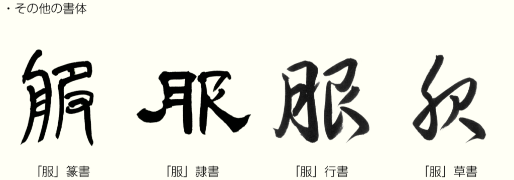 」は金文を見ると、跪く人(卩)を後ろから手「又」で押さえ付ける形になってるね。左側の「月」は舟の形で、実は水を入れる盤を表すんだ。儀礼の時に使う神聖な器だよ。その盤の前に人を跪かせ、後ろから押さえ付け、「負けました」と、降服させる儀式を表した形の字なんだよ。つまり人を屈服させる様子から屈服させられる側の「したがう・おこなう・はたらく」の意味になった。服務・服役(仕事に就く・労役に従う)、敬服(心から尊敬する)、服従(他の命令に従う)などと使うね。やがて、着る服にも用いるようになったよ。服用(薬を飲む)、心服(敬うように尊敬して従う)とも使うね。ところで洋服は一着、二着と数えるよ。一服、二服はお茶や薬を飲む時だね。でも「一服盛る」はちょっと怖いなぁ~。ここまでで不服ある人?