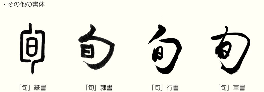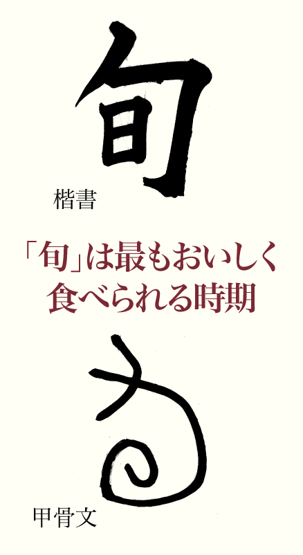 中国では古来、10日間を意味し、今でも1カ月を上旬じょうじゅん中旬ちゅうじゅん下旬げじゅんと分けて呼びます。「三じゅん九食」は、1カ月に9回しか食事ができないことから生活がひどく貧しいことを意味する熟語。日本では草木などの盛りの時期も指し、そこから魚介、野菜などの味が最もおいしい時期を意味するようになりました。