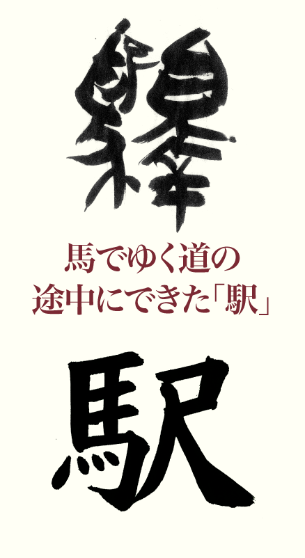 旧字は「驛」で、金文を見ると、右の「睪」は獣の死体を表し、上部「罒」が目、下部の「幸」は肢体(手足)だよ。死体はやがて分解するので、「睪」はバラバラに解れて長く続く状態をいうんだね。昔は長い道を馬に乗って移動した。途中には宿が建ち、馬を乗り換える「厩」もできたんだ。だから、驛は長い道路に連なって置かれた「厩」を指すよ。中国秦漢時代には主街道に驛(30里ごと)を置き、馬を用意して荷物の載せ替えや、旅人を泊めていたよ。日本に同じような驛があり、鉄道の時代になっても「駅」というんだ。そういえば、正月に箱根駅伝があったね。駅で荷物や手紙を載せ替えて次に伝えるところから、駅伝という熟語が生まれ、一本の襷をつないで走る駅伝競技は日本で始めたんだ。競走だけでなく心を繫ぐことを大切にする日本人らしいスポーツといえるね。