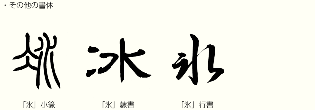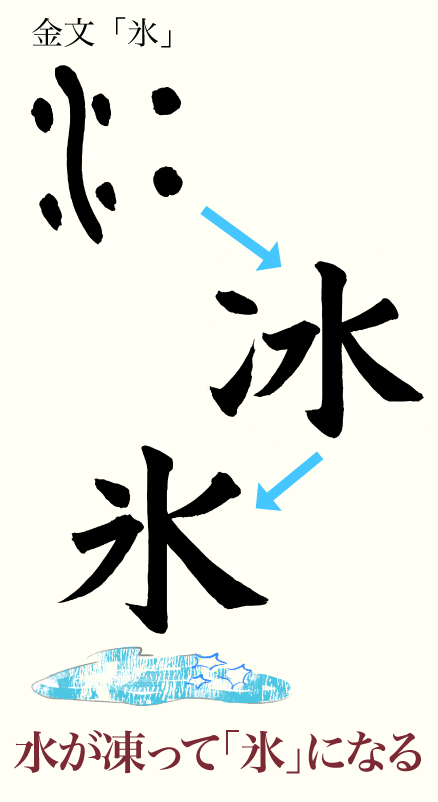 「氷」という字は「ヽ」と「水」からできています。この2画目の点は、水が凝結してできた形の象形文字で、氷の粒を表しています。中国・春秋時代(紀元前8~5世紀)の金文という古い書体では右側にありました。この字が元になって長い間、「冰」と書かれていましたが、楷書の完成期である中国・唐時代あたりに2つあった点が省略され、「氷」となりました。