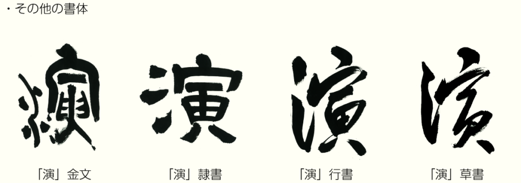 「演」の文字の成り立ちは、「氵」と「寅」との会意による会意兼形声文字です。「流れる水の象形」と「両手で持って矢柄を直す象形」から、水が流れるようによどみなく述べる、物事が滞りなく進むという意味を持つ「演」という漢字が成り立ちました。