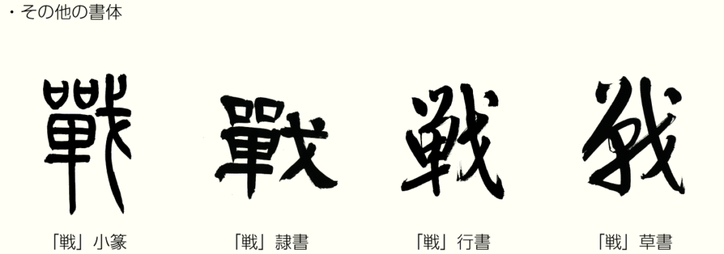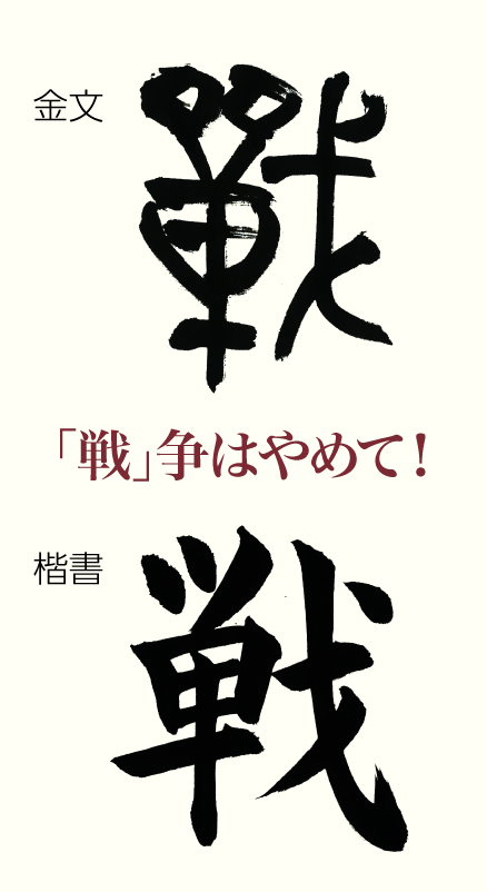 「戦」の文字の成り立ちは、「単」と「戈」の会意による会意兼形声文字です。甲骨文字では「単」は「盾」のことを表し、防御することを意味していましたが、そこに「矛」を表す「戈」が付くことにより、攻撃することを意味するようになり、「単(盾)」と「戈(矛)」が向き合うさまの「戦」という言葉が生まれました。