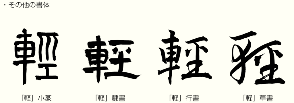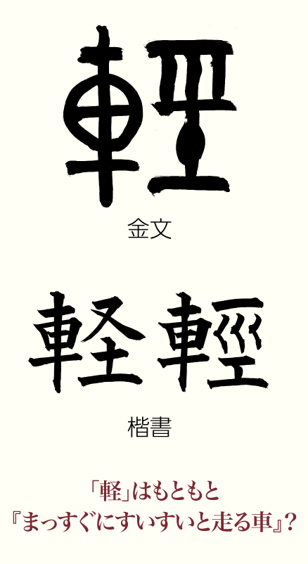 春になるにつれて体も動かしやすい季節になり、気持ちも軽やかになってくる方も多いでしょう。今回は『軽』についてみていきます。『軽』のもともとの字は『輕』です。『輕』を分解すると『車』+『巠』となります。『車』は馬に引かせる馬車を表した漢字です。今では、車は自動車のことですが、昔は馬が引いた車を指しました。一方、『巠(ケイ)』という漢字は、工作台の上に縦糸を張ったさまで、『まっすぐ』を表しています。そこから『まっすぐにすいすいと走る車』、転じて『身軽なこと、軽い』の意味が生じたとされています。なお、『巠』の部首は『巛』の、『くの曲がった部分』で『まがりかわ』といいます。『巠』は単独で使われることはないですが、その省略形の『圣』が、径、経などの漢字のパーツとして使われます。