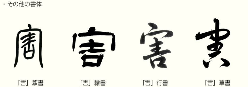 よく似た字の「舎」の旧字「舍」は、もう少し小さい針で刺す形(同じく突き抜ける)で、捨てるという意味で使われた。今の「害」「舎」は針の先が祈りに届かないから、害したり捨てたりがなく無害の字ともいえるね(笑)。