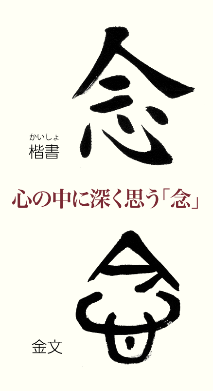 「念」は「今」と「心」の形声文字で、音読みは「ネン」、訓読みは「おも(う)、こころ」です。「今」の金文「