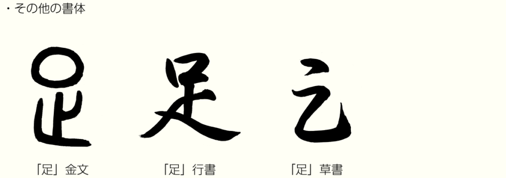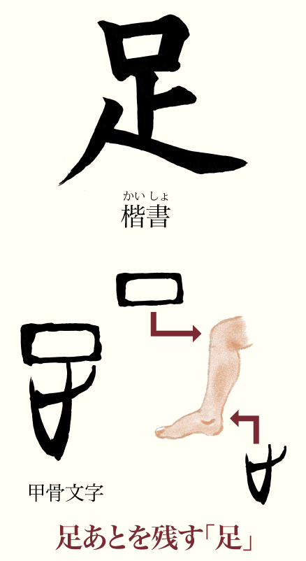 「足」は、膝からつま先までの形を描いた象形文字ですが、「足」という字をよく見てみると「口」と「止」からできています。「口」は、膝の骨を表し、「止」は足首の象形で、足あとの意味でも使われます。つまり「足」は、象形文字でありながら、2つの漢字の意味を組み合わせた会意文字ともいえる字です。また、「ソク」という音は意味合いから「直」や「属」が変化したものと考えられています。
