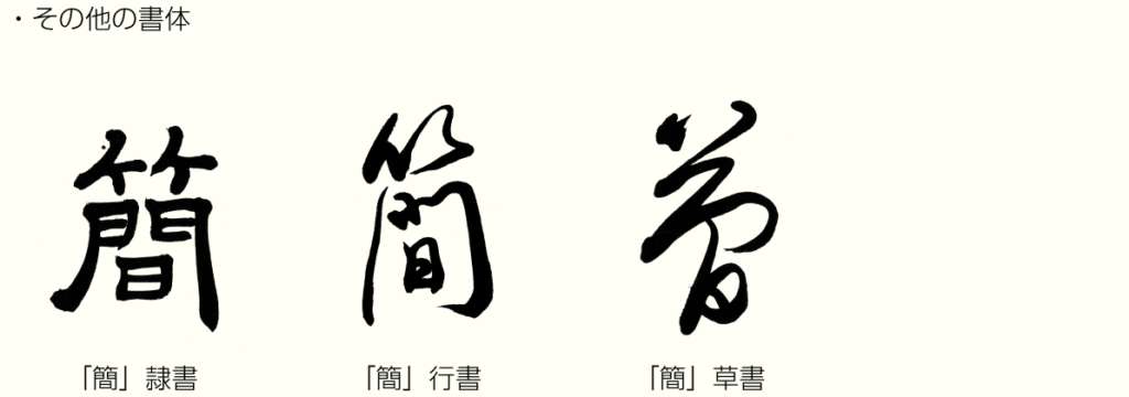 今回は「かん」についてお話しします。「簡」は意味を表す「竹」と、音を表す「かんかん)」を併せた文字です。「竹」は竹、「間」はすきま、あいだを意味し、「簡」はんでいない、ばらばらの竹のふだのことをいいます。そこから紙のない時代、竹を細くけずり、文字もんじを書き、それをいくつもひもじ丸めたものを「簡書かんしょ」といいます。現在の書物しょもつ、手紙に相当するものです。