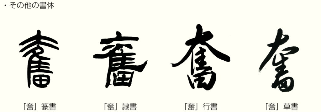 そこから鳥の羽ばたきのように「はばたく・ふるう・はげむ」意味になった。・奮起・奮発・奮闘・発奮・奮戦と使われるんだ。