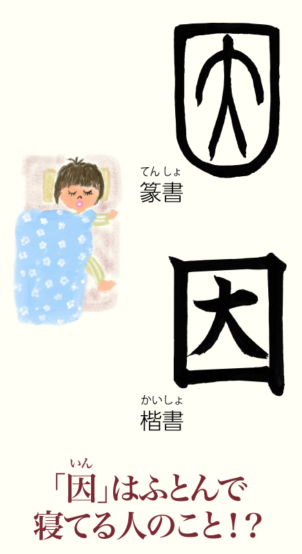 今日の漢字は「因」という字。この字は、2つの部分から成り立っている会意文字で、四角いふとんを意味する「囗」と手足を広げて寝ている「大」からできています。ふとんで寝ている人を上から見た形ですね。また、別の解釈もあり、「囗」は家の意味で、を囲っていることから、人の家に身を寄せて生活するという見方もあります。居候ですね。