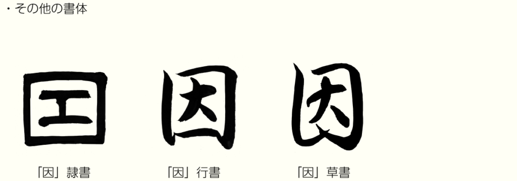 「因」には、「たよる」、「もとづく」、「よる」などの意味があり、「原因」、「因果関係」などという使い方がされるようになりました。