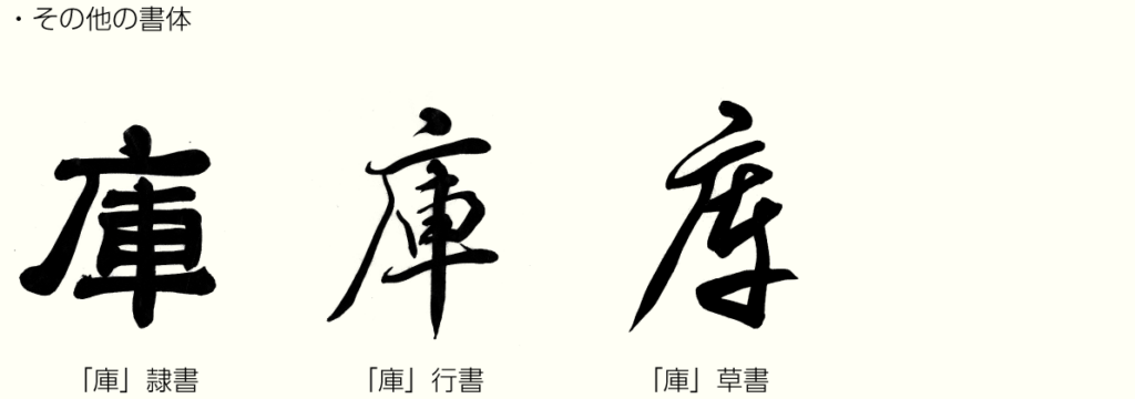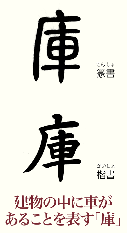 「庫」は小学3年生で学ぶ漢字で「コ」「ク」と読み、「くら」のことを表す文字です。「庫」は、建物を表す「广」と「車」からなる組み合わせで、建物の中に車があることを表しています。現在のように車は誰もが気軽に乗れるものではなく、昔は身分の高い人だけしか乗ることができなかったのです。
