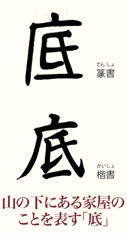 「底」は小学4年生で学ぶ漢字で音読みでは「テイ」、訓読みでは「そこ」と読みます。「底」は家屋かおくを表す「广げん」、丘や山を表す「」に通じた「」、地を表す「いち」からなる組み合わせで、山の下にある家屋のことを表します。ただし、時が経過するとしだいに「底」が家屋を表す漢字であることが忘れられ、「ひくい」とか「した」を表す漢字として使用されるようになりました。