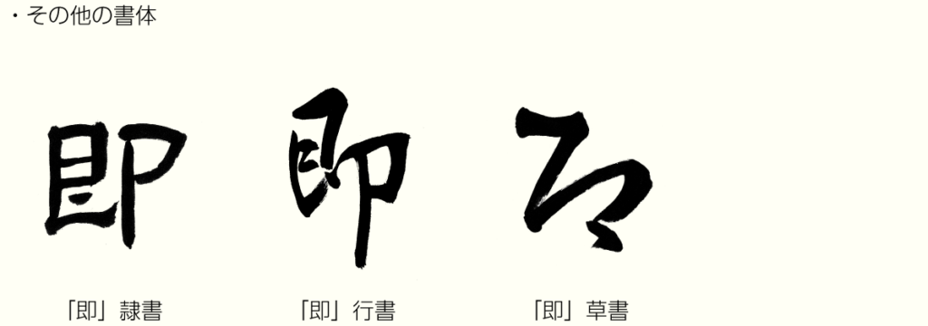 これから食事しようとする姿を表した文字「即」は、即席(その場で)、即興・即座(すぐに)、即今(ただ今)、即命(命を受ける)、即位(位につく)などの表現として使われています。