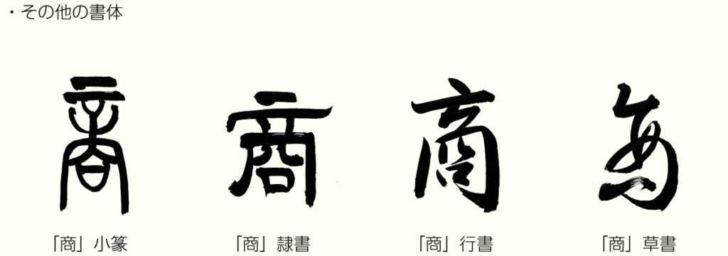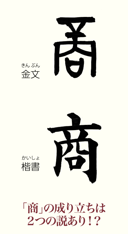 一つの説は、漢字を分解すると、「へい(=台)」+「章を簡略かんりゃく化した書体」となり、高台を意味します。殷人いんじんが好んで高台に集落をつくり、「商」と自称し、周にほろぼされてからは、離散りさんした殷人が、みずからの作る工芸品などを全国に売り歩いたとのことから、「あきない」の意味が生じたとされました。