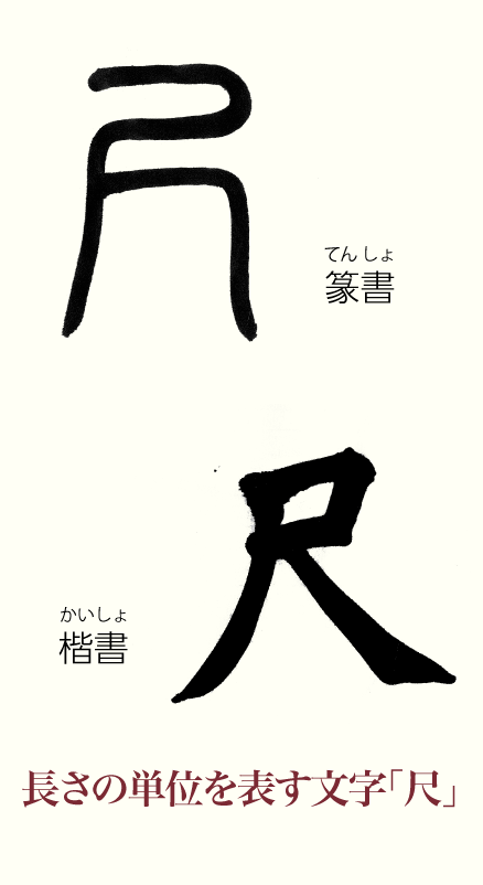 「尺」は「シャク」「セキ」と読み、長さの単位を表す文字です。重さの単位を表す文字は「貫」で、日本ではかつては尺貫法とメートル法を併用していました。しかし、尺貫法は昭和34(1959)年に廃止され、メートル法のみが使われるようになりました。ちなみに一尺は約30.3センチです。
