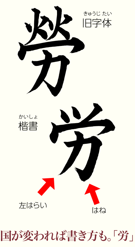 現在、私たちが使う「労」という字には「火」が含まれていません。これは難しい漢字を覚えやすく、速く書くことを重視したため省略されたからです。漢字を使用している国によっても違いがあります。漢字が生まれた国、中国では「劳」、台湾では、旧字体をそのまま使い「勞」と書きます。