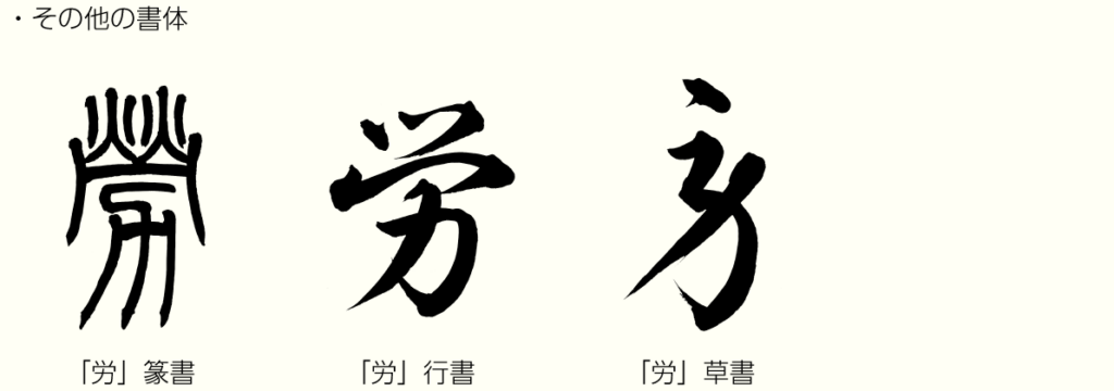 「労」は、古くは「勞」と書かれていました。なぜ「労」は字の中に「火」が入っているのでしょうか。「激しく燃えるように力を出しつくすから」、「小さな火の下で、仕事をするから」、「農具を火によって清めたから」など諸説があります。
