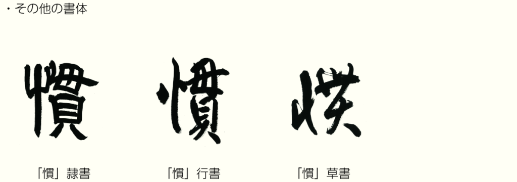 「慣」は「忄」(りっしんべん)に「貫」が組み合わさった文字です。まず「忄」は「心」という文字を立てて、偏になった部首で、おもに感情や思考といった心の動きを表す漢字に使用されます。