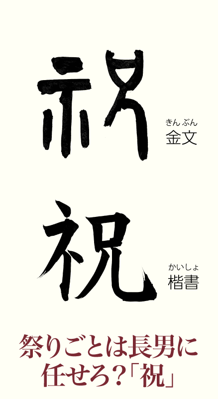 漢字を分解すると、「示」+「兄」となります。「示」は、神を祭るときに使う机である「祭卓」を表します。一方「兄」は、神への祈り文である祝詞を入れる「器を頭に載せている人」を表します。家の祭りごとを担当する者は、兄弟の中では長男であったとされています(ちなみに、末娘は嫁がずに家に残って家の祭祀を守るというような風習があったようです)。これらを組み合わせて「神を祭っている人」を表した漢字で、のちに「いわう」の意味にも使われたとされております。