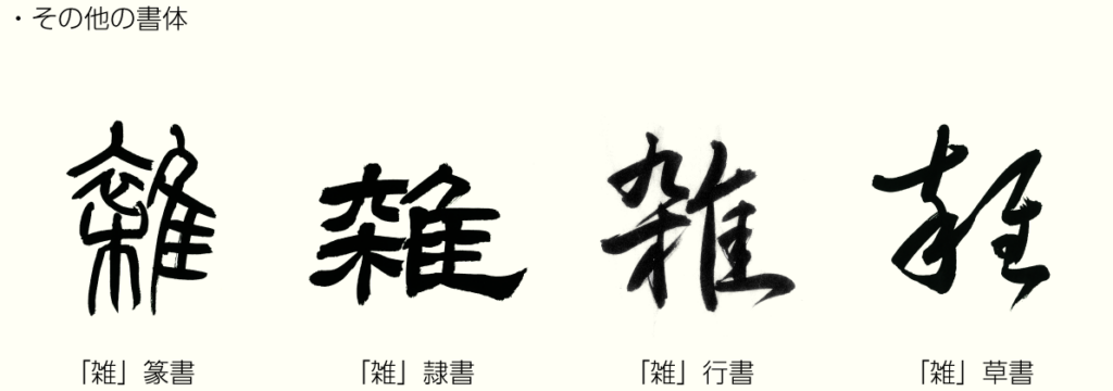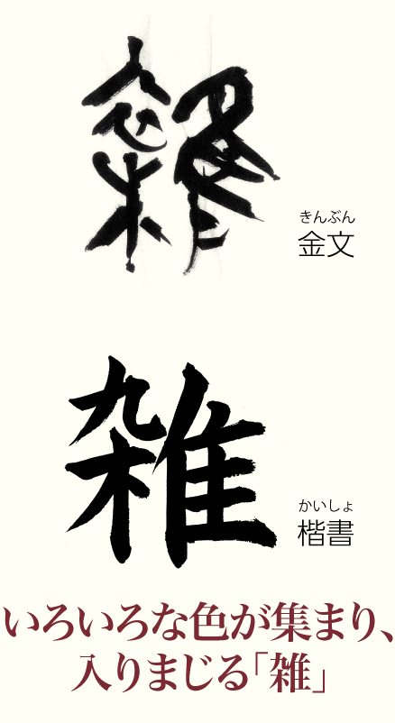 旧字は「雜」。分解すると「衣」と「集」で、集の旧字は雧。隹は鳥の形(金文)だから、木の上にたくさんの鳥がとまる形から集まる意味に。ちなみに隹に似た雈はミミズクで、雚はコウノトリを表すんだ。雑は「衣」と「集まる」の組み合わせで「多種の草木の染汁を集めて、さまざまな色の衣を作ること」を指し、多種の草木の色がまじることから「いろんな・こまかい」という雑音・雑貨・雑務・雑役や、「入りまじる」意味で雑居・雑然・混雑・複雑などと使われるよ。