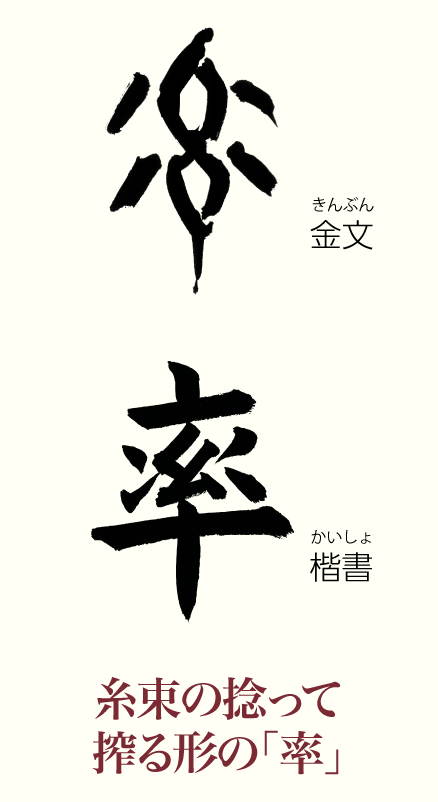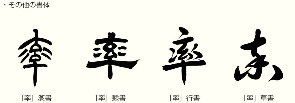 「率」の読みでは力を込めて「ひきいる」意味で引率・統率・率先と使う。水を搾り尽くすので、「ことごとく、みな、おおむね」の意味で大率などとも用いるよ。