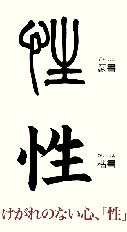 今日は、「性」という字について見ていきましょう。「性」という字は、「心」と音を表す「生」とからなります。「忄」は心、「生」は草の芽が生き生きと伸びている様子で、けがれのないことを表しています。よって、生まれつき持っているけがれのない心という意味があります。