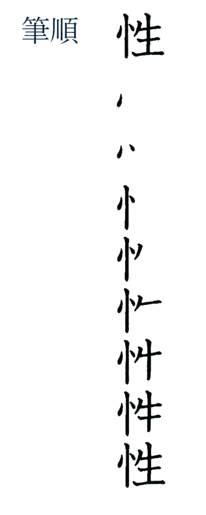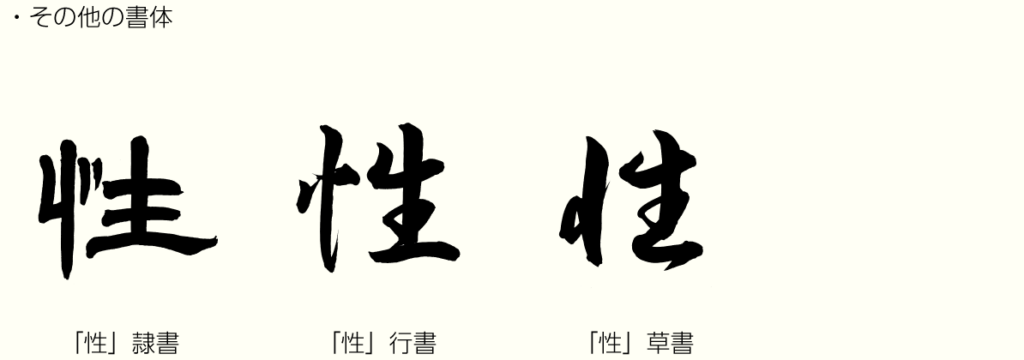 さて、この字を説明するときによく、「りっしんべん」に「生まれる」という言い方をします。「りっしんべん」とは、「性」の左側にある偏の名称で、これを漢字にかえると「立心偏」となります。つまり「忄」は心の一部分が縦に変化したことによってこの名がついています。