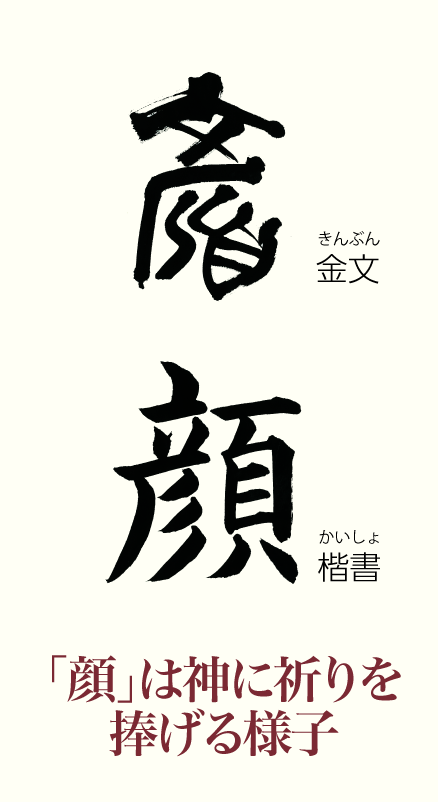 「顔」は「彦」と「頁」との2字の漢字で作られる会意兼形声文字です。「彦」は旧字体の「彥」で見ると、「文」は古代中国・殷の時代の風習で、朱色などで体に描いた入れ墨のことをいい、それに額を表す「厂」、色や形が揃っていることを表す「彡」が組み合わさり、美しい表情をした男性を意味します。「頁」は人の「顔」に関する漢字に使われる部首で、祖先を祭る廟に参拝する姿を表すことから、「顔」は神に祈りを捧げる様子を意味します。