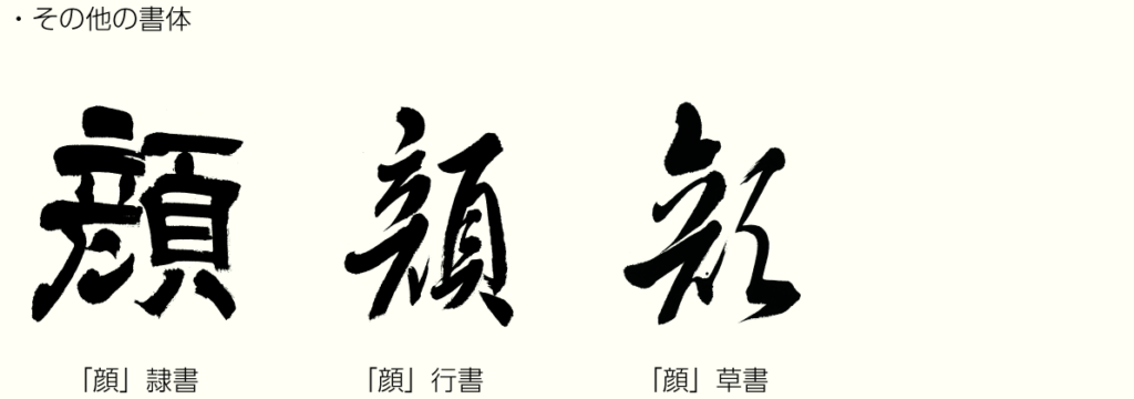 読みは音読みでは「ガン」。訓読みでは「かお」です。語例としては、「笑顔」「顔面」「顔色」「顔料」「童顔」などです。