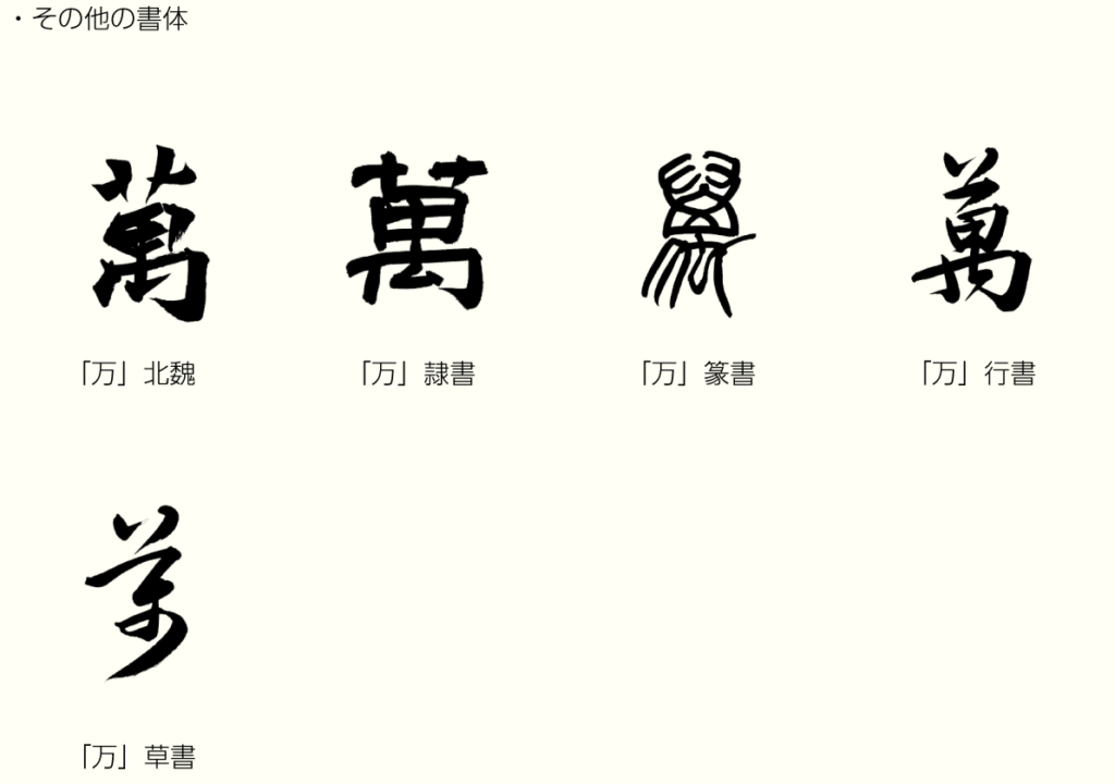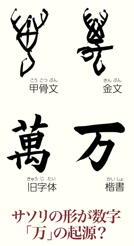 「万」の旧字は「萬」で、元字は蠍と思われる虫の形(金文)からできた。でも、そのような有毒生物の名前として使用した例はないんだ。「萬」は甲骨文字の時代から発音が似ていた数の「10000」の意味として使われていたようだ。「万」は「萬」の略字ではないものの、これも「10000」と発音が似ており、時をへて「万」=「萬」となったと見る向きが多いんだ。