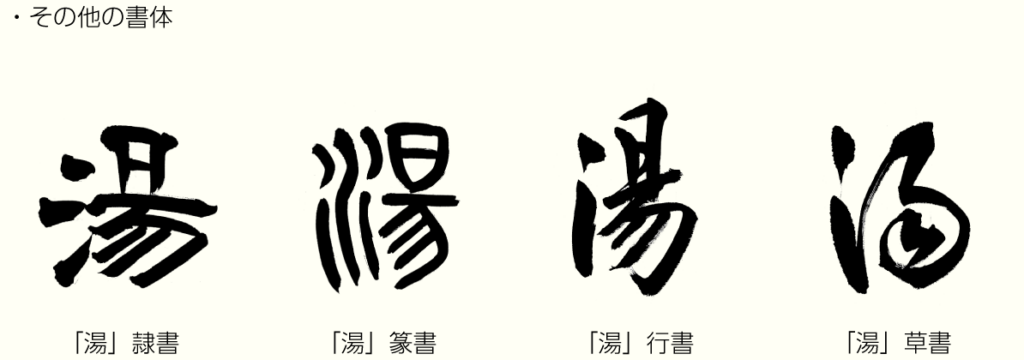 つまり、「湯」は、複数の漢字(象形文字)を組み合わせた「会意文字」であり、意味と音を示す部分で構成される「形声文字」でもあります。
