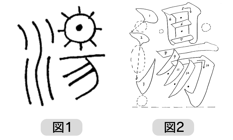 さらに分解してみると、「昜」は、太陽が昇る様子を描写。「氵」とペアになることで「湯気が上がる」情景をイメージできます(図1)。書き順を見ても、水の循環を想起できますね(図2)。