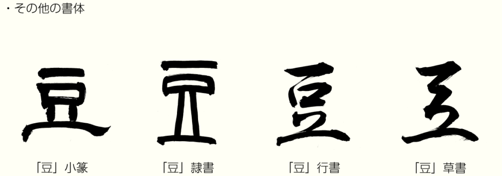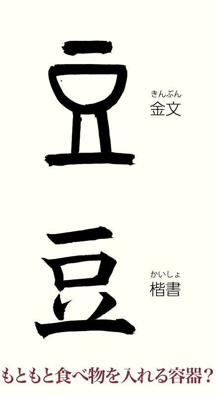 もともと「儀礼の時に食べ物や飲み物を入れる脚の高い食器」からできた文字で、その食器を「豆」と呼んでいました。