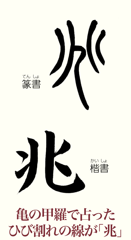 今回は「兆」を考えてみます。古代中国では亀の甲羅や獣の骨に文字を刻んで焼き、占いをしました。焼くと縦横にひび割れの線が現れ、その様子から「ぼく」の形になりました。また、そのひびの割れ方はこれから起こることの「きざし」と考えました。