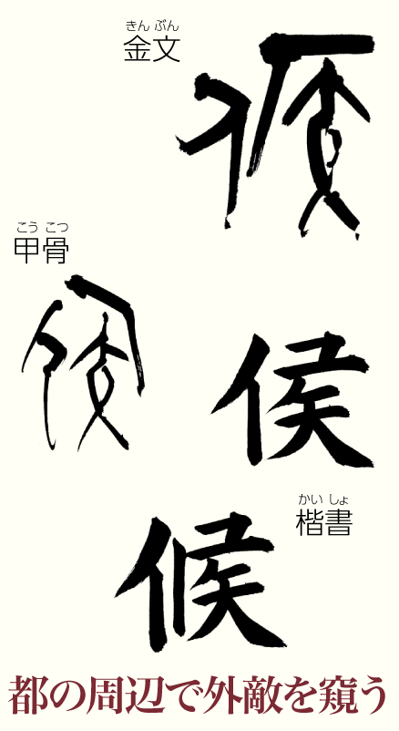 次に屋根の上で邪気を祓う形を示す「こう」となり、儀式に付き従う「人」も加えて「侯」に。「侯」は都の周辺で外敵の様子をうかがい、都を守る者を意味し「諸侯」の言葉ができました。
