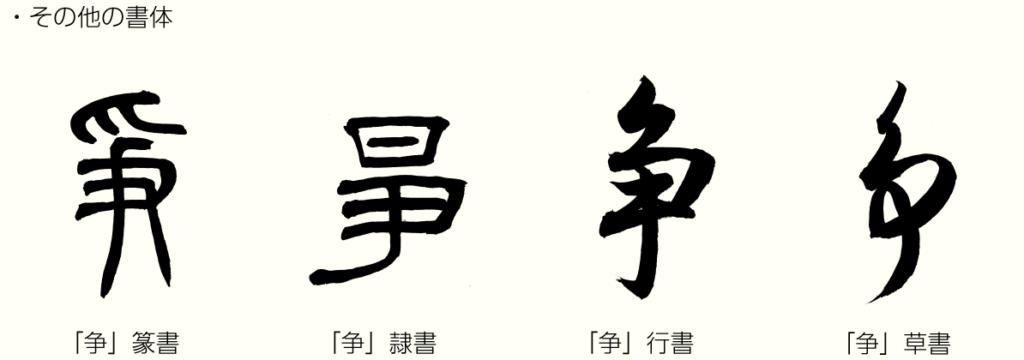 ちなみに「争」を書く際、留意したいのは、教科書体などの印刷文字と、人が書写した手書き文字では形がやや異なる点です。印刷文字は四角い箱の中に収まるような構成ですが、手書き文字の「争」は本来、縦長の字形です。