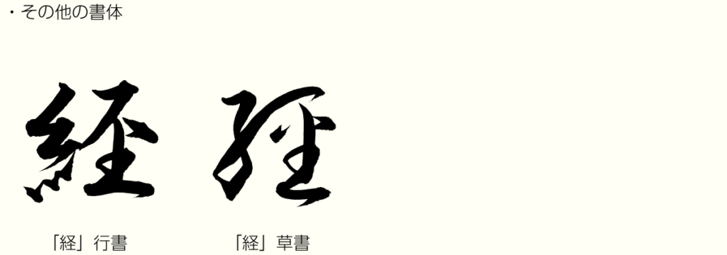 「經」は「経」の旧字体です。これは漢和辞典の基となった中国、清時代の康熙字典が、顔真卿という唐時代の書家の影響を強く受けて作られたからです。顔真卿の家系は代々、古代中国の篆書や文字学を研究する家柄でした。顔真卿もその影響を受け、楷書に篆書体に基づく文字をたくさん残しています。