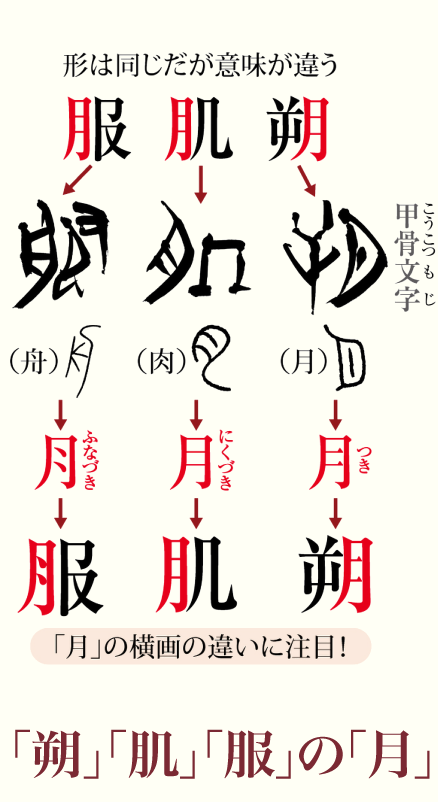 今回の「朔」「肌」「服」は、いずれも「月」を含みますが、同じ意味で使われてはいません。