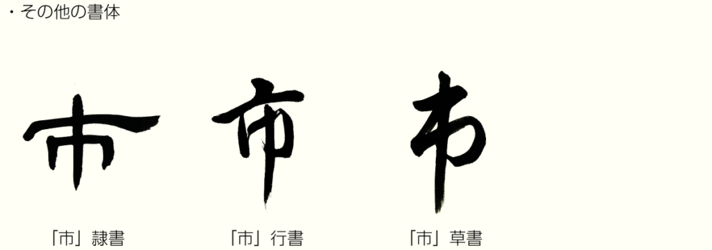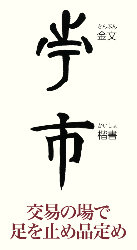 古代文字の金文の市()は、標木を立てた形の上に止()まる意味。売り手と買い手が足を止め、品定めする様子が想像できます。後に朝は朝市、大市は午後から夕暮れ、夕市は夕暮れからと、扱われる物によって市の時間帯も変わってゆきました。