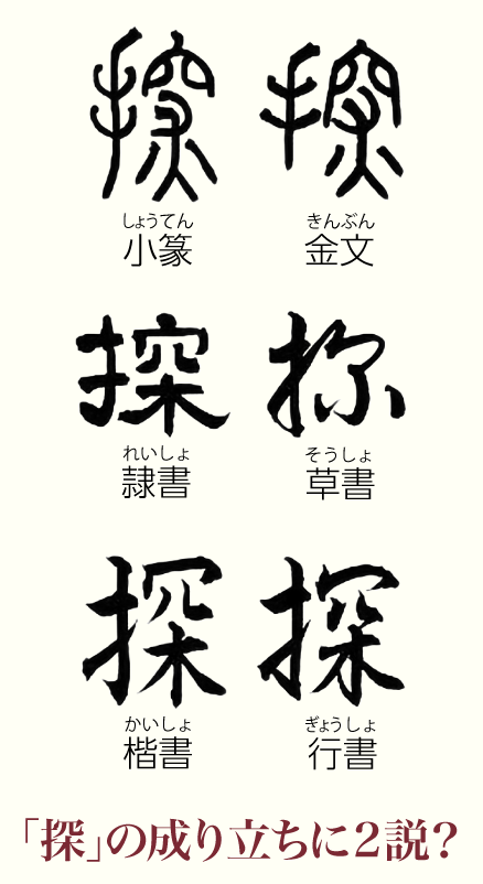もう一説として「探」が「手と子宮」から成り立っているという説です。扌は手、は子宮で、出産の様子を表したとされています。
