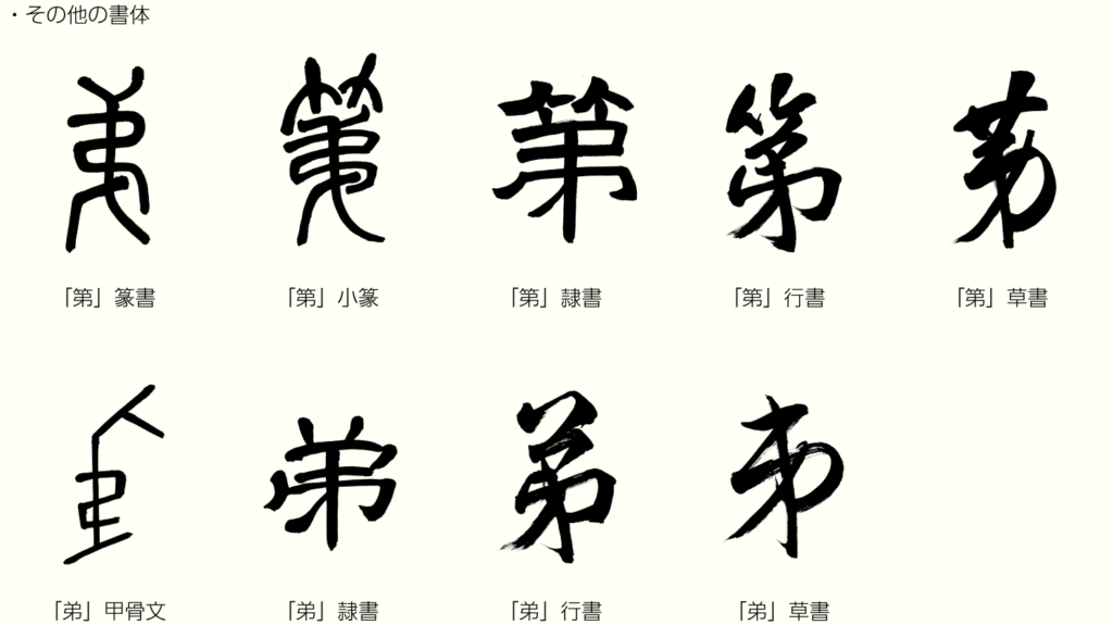 中国・後漢時代の儒学者、許慎が著した字書「説文解字」には「弟」が記載されています。しかし、「第」は不記載で、古代文字の甲骨文にもありません。