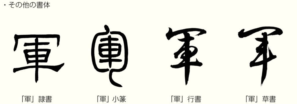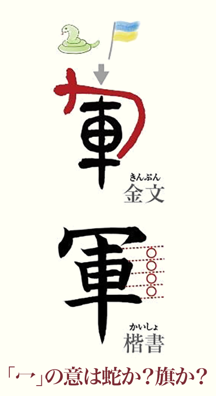 「軍」の一部である「車」は、戦争の時に将軍が乗る戦車を表していますが、「冖」には2つの解釈があります。1つは蛇がとぐろを巻いている姿という説。もう1つは、戦車の上に立てた旗がなびいている形です。これらが発展して兵士の集まりという意味で使われるようになりました。