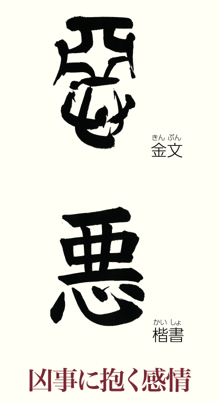 棺を納める墓の部屋の天井や壁には白い土「堊」が塗られました。部屋の白さはどこか不吉な心情を催すため、「亞」に「心」が付いた「惡」の字には凶事の意味が出てきたのです。