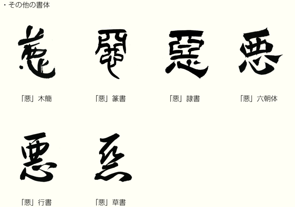 「悪」の旧字は「惡」で、「亜」の旧字「亞」と「心」で構成されています。凶事を意味し、「悪意」「悪魔」「悪寒」「罪悪」「憎悪」などと使われます。