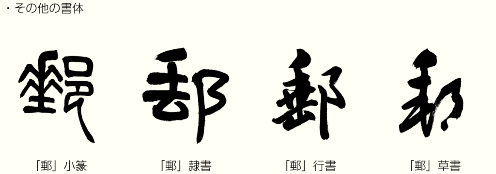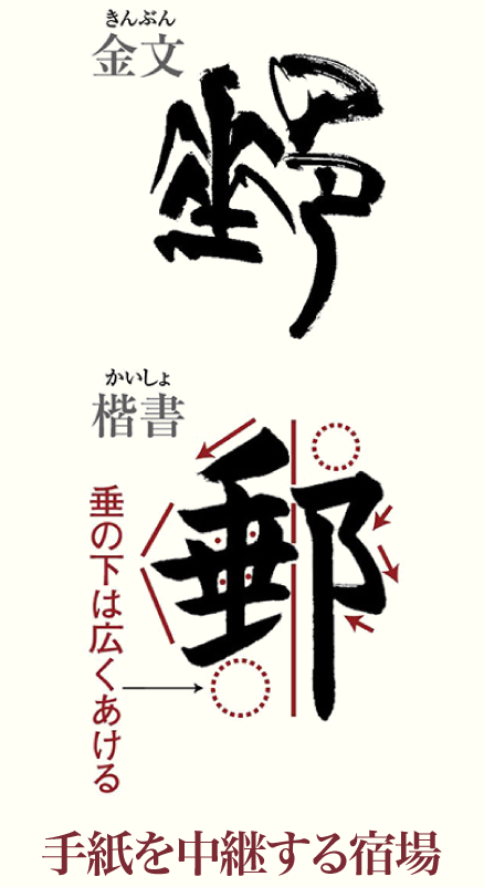 つまり、「郵」の字は、辺境で人々が集まる集落、すなわち宿場の意となり、これ1文字で「しゅくば」と訓読みもします(常用漢字表外)。また、宿場は、公用の手紙や荷物を中継する人が集う場でもあり、「郵」の字は郵便を示すようになりました。
