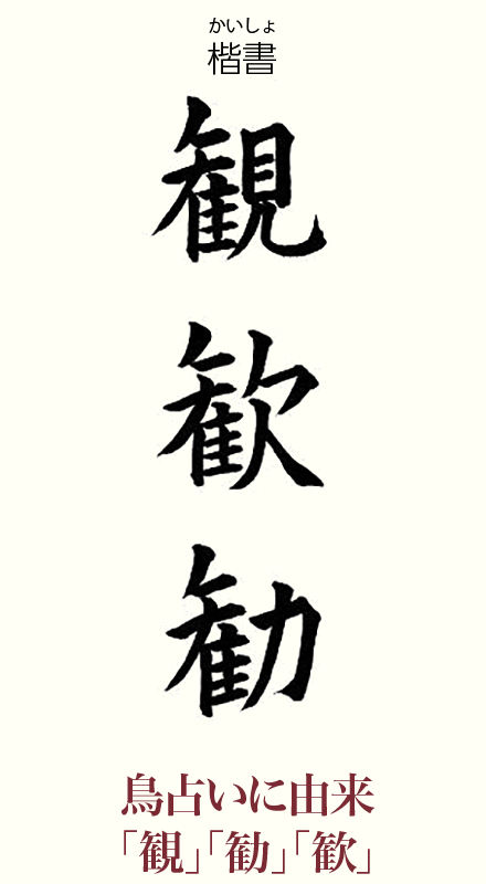 古代では甲骨文の占いだけではなく、神霊の化身と考えられた鳥も占いに使われました。今回は鳥占いに関係する「観」「勧」「歓」を見ていきます。