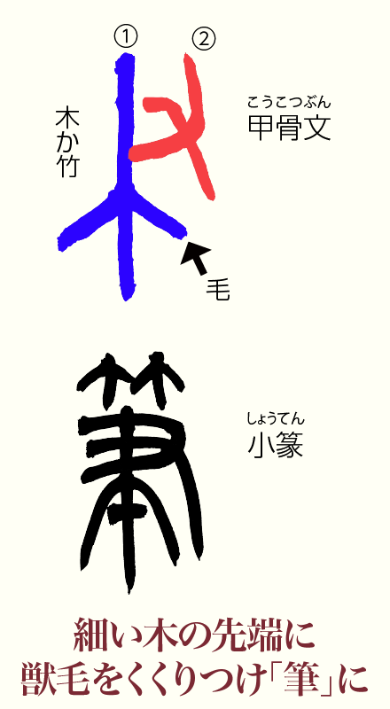 その文字を詳しくみると、①「毛をつけた木か竹」を②「手で持っている」形をしています。現在のような「たけかんむり」はありませんでした。時代が下り、軸に竹が多く使われるようになると、中国・秦代の小篆(楷書の原形)では「たけかんむり」を付けた現在の形になり、「筆を使って書く」という意味で使われるようになりました。