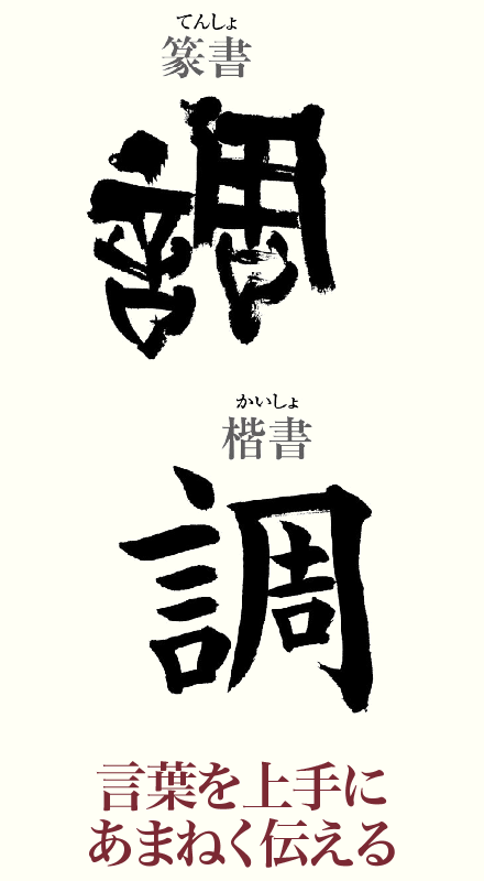 「周」に「言」が加わると、「言葉を上手にあまねく伝える」が意味のベースになりました。「整う」「つり合う」「調べる」などの意味が出て、「調整」「調査」「調律」などと使われています。